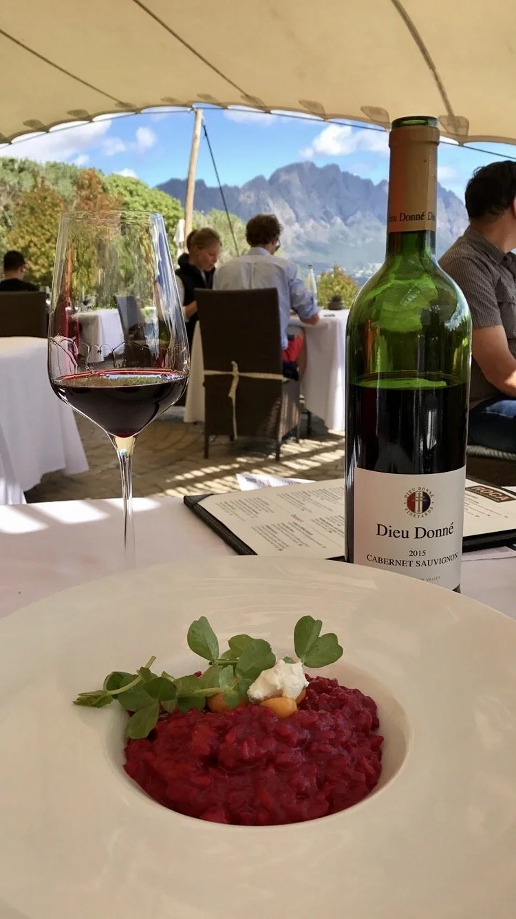 Dieu Donné - This dreamy vineyard is set high up on the hill and overlooks the Franschhoek Valley and mountains beyond. We decided to visit this one on our own (thanks to a ride in the TUK TUK) and spend a while there so we could relax and soak in the view. According to their website, the onsite restaurant is currently closed, but hopefully it reopens soon! I had a delicious beet risotto and we enjoyed live music while splitting a bottle of Cabernet Sauvignon.
