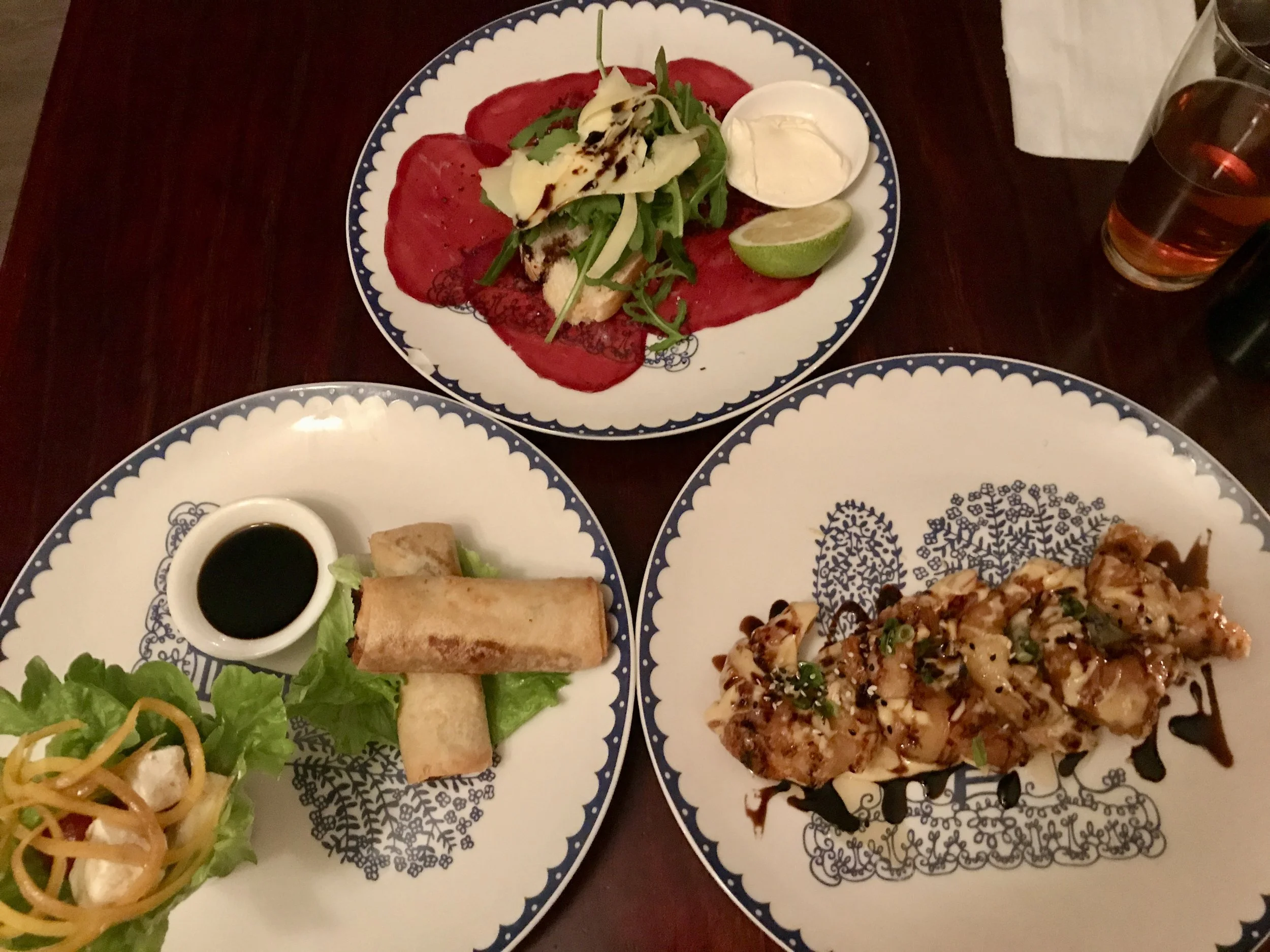 Bobotie springrolls, Springbok carpaccio, and tiger prawn tempura at Burgundy Restaurant